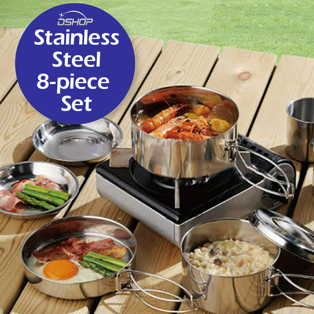 8-Piece Stainless Steel Camping Cookware Pots Pans Plates Mugs Set
