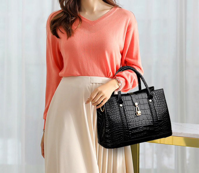 3 PCS Luxe Faux Crocodile Leather Handbag Set, Large Tote, Shoulder Bag, Purse Wallet (Black)