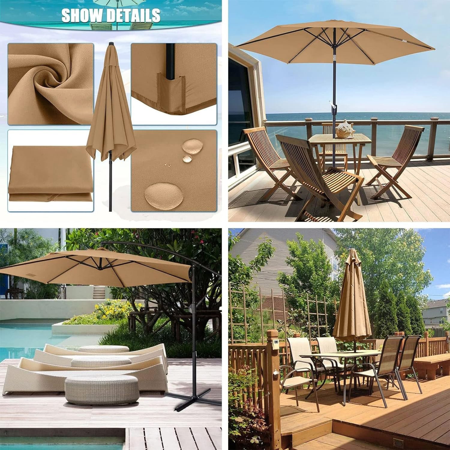 Cantilever umbrellas give free space under the canopy with no centre pole in the way and are ideal over lounges and dining settings. They are also called offset umbrellas or side pole umbrellas. Market umbrellas fit neatly through table holes and suit compact patios and balconies. For travel, choose a lightweight beach umbrella with a carry bag.