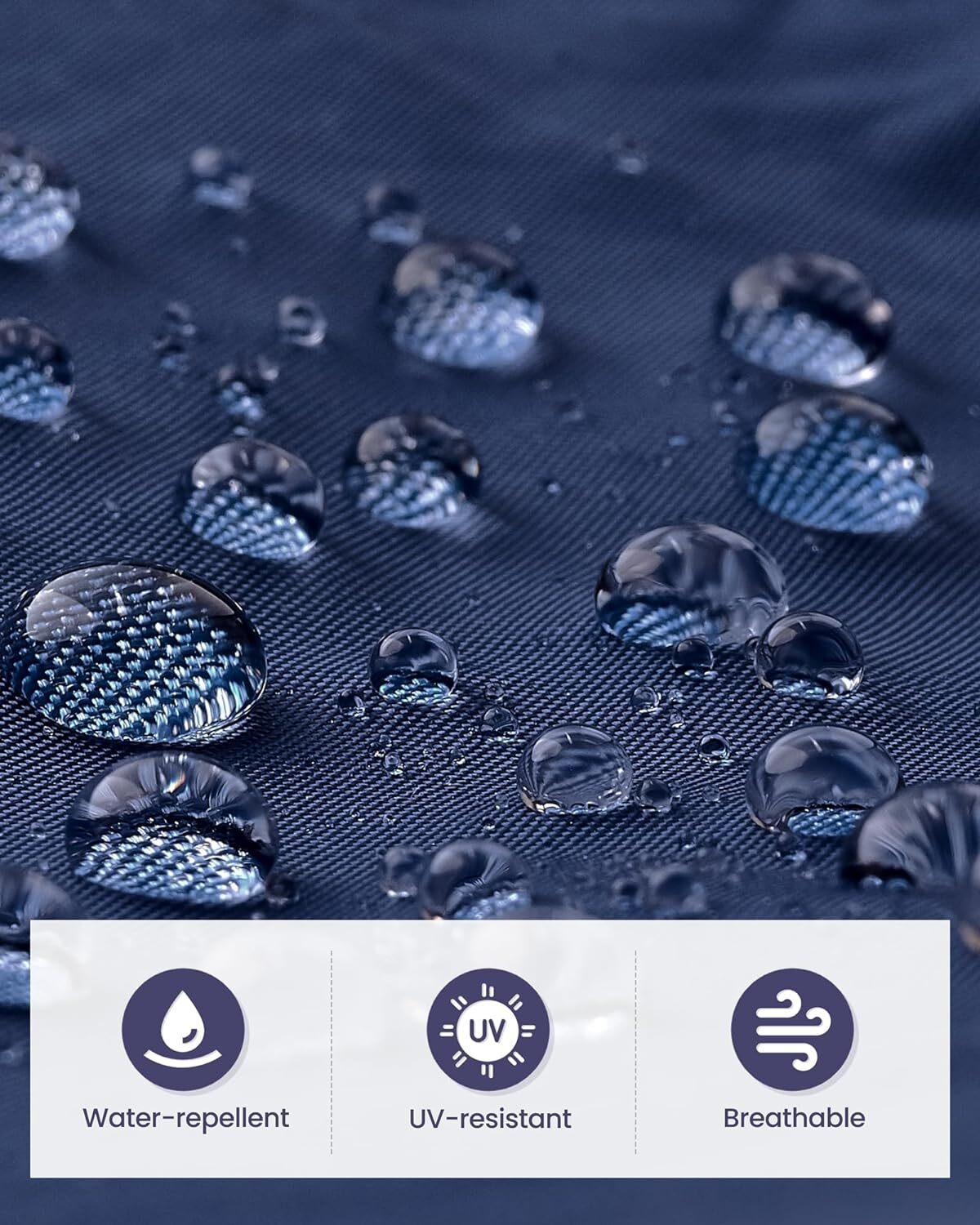 Umbrellas use water repellent fabrics suited to light showers and UPF 50 plus materials that help block UV rays. Dry fully before covering and store closed during bad weather to prevent damage and mildew.
