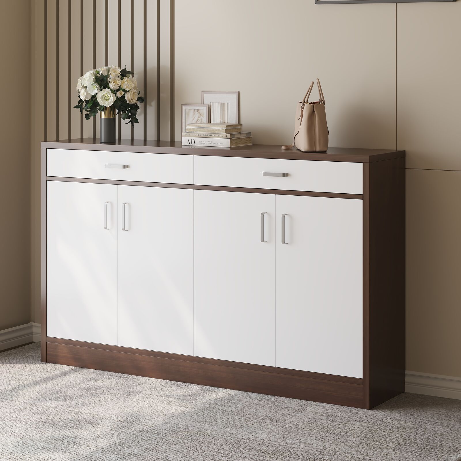 Elements 4-Door Double Buffet Shoe Storage Cabinet (Walnut & White)