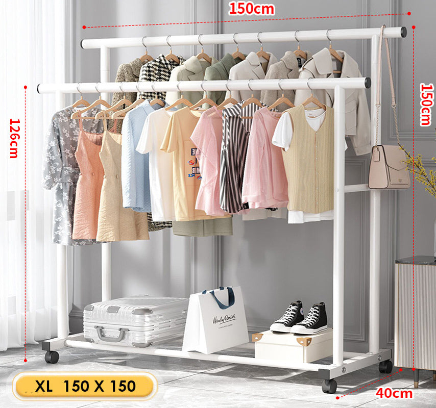 Large 1.5m Wide Double Coat Hanging Stand Wardrobe Clothes Hanger Rack (White)