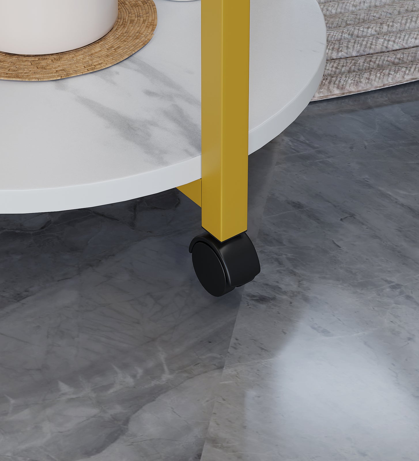 Perfectly combining the sturdiness of steel with the warmth of wood, this unique and stunning table features a stylish marble-look finish. Double shelves offer extra convenience and storage space, and the four wheels allow for easy portability.