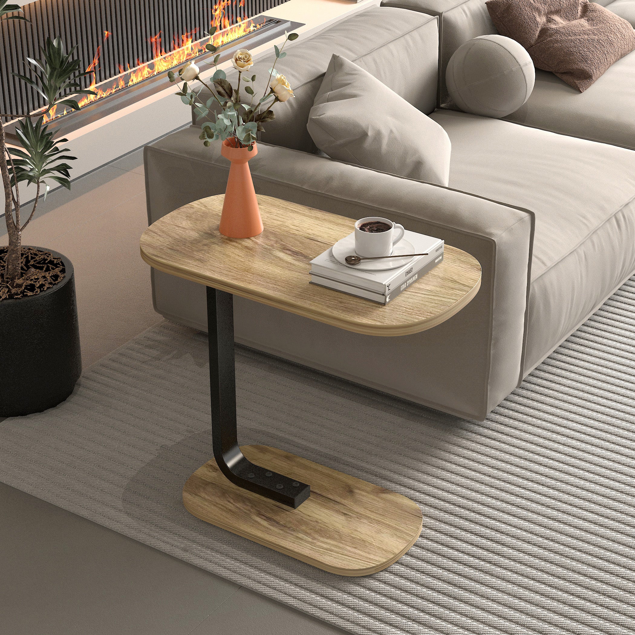 Enhance your living space with this sleek and rustic side table that beautifully combines the warmth of wood with the sturdiness of metal. The rich, rustic wooden tabletop adds character and charm, providing a welcoming, natural touch that complements any living room decor. Supported by a robust metal base in a minimalist design, this table offers a perfect balance of rustic warmth and modern simplicity. The smooth, oval wood surface provides ample space for your essentials, making it ideal for keeping drinks, books, or decorative items within reach. Its unique slide-under design allows it to nestle effortlessly under your sofa or bed, saving space while adding convenience and style.