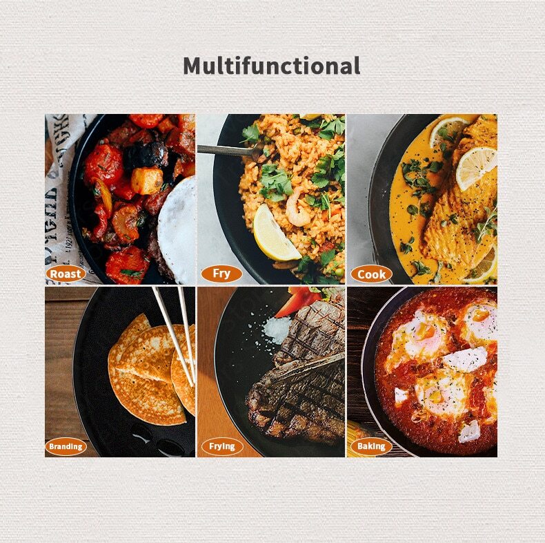 Great for indoor and outdoor use, our grill pan is perfect for the kitchen, camping, hiking, picnics, and other outdoor activities. The premium die-cast iron conducts heat quickly and evenly, ensuring superior heat retention and high thermal conductivity. With its classic cast iron design and suitability for all cooktops, including gas and induction cookers, it's a versatile tool that you can use anywhere.