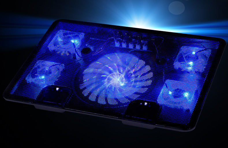 Featuring an ultra-slim, sleek design, this XL 5-Fan Laptop/Notebook Holder Cooling Pad Stand is the perfect blend of style and functionality. Outfitted with an extra-large central fan and four auxiliary fans, it delivers superior cooling capabilities for any heat-intensive laptop usage. The fans are bathed in an aesthetically pleasing blue light, adding a touch of elegance to its performance.